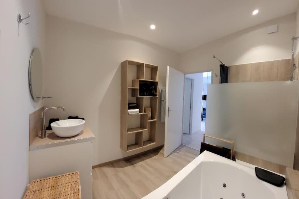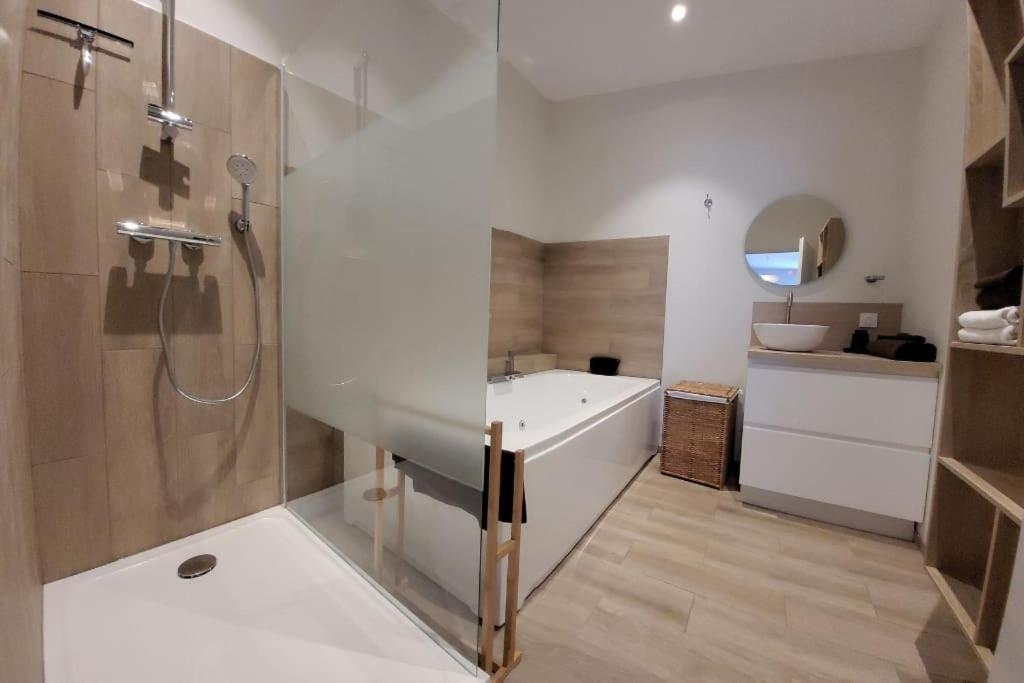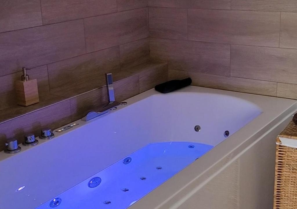 Profitez d’un espace chaleureux équipé d’une baignoire balnéo pour 2 personnes, parfait pour un moment de relaxation après une journée de découverte dans la région.